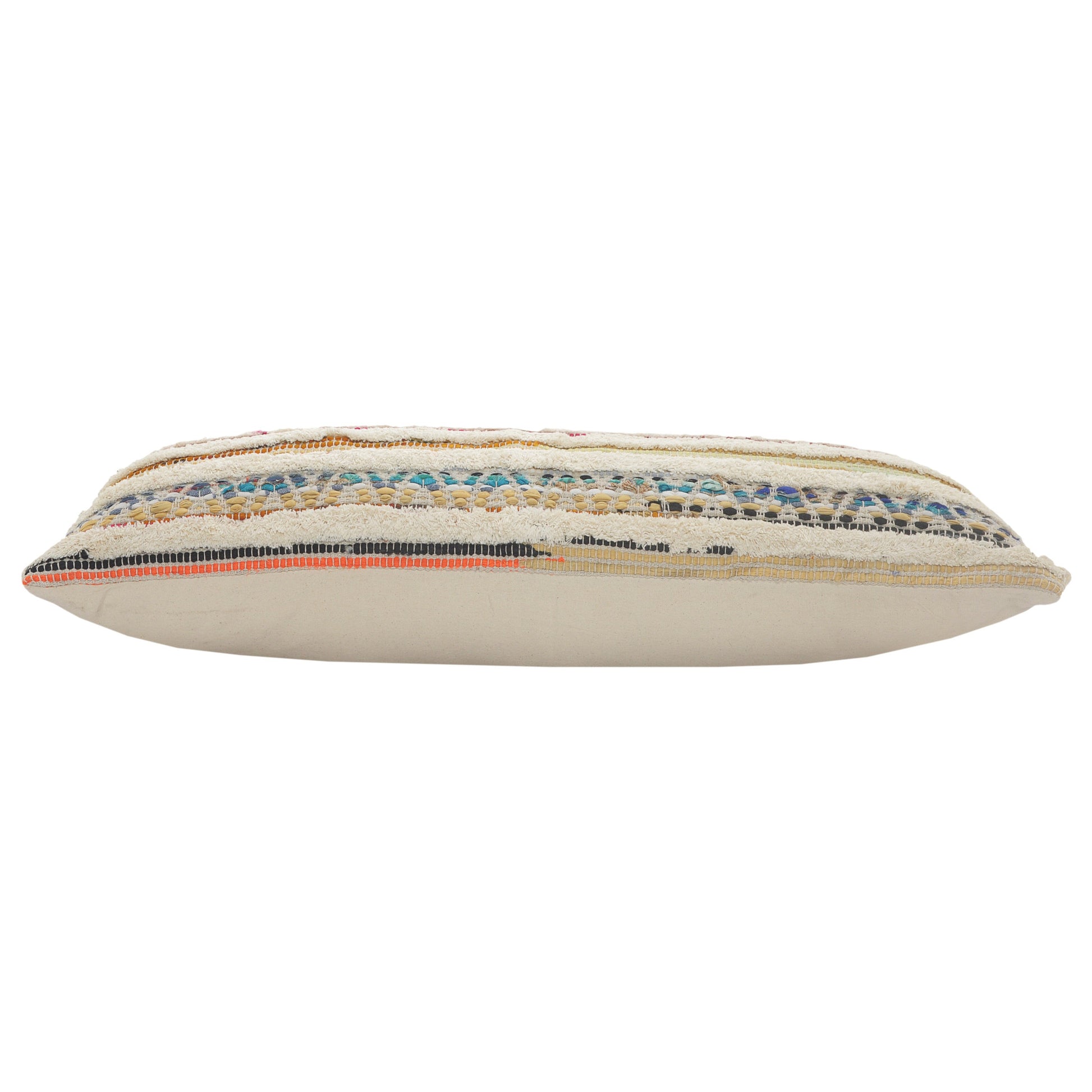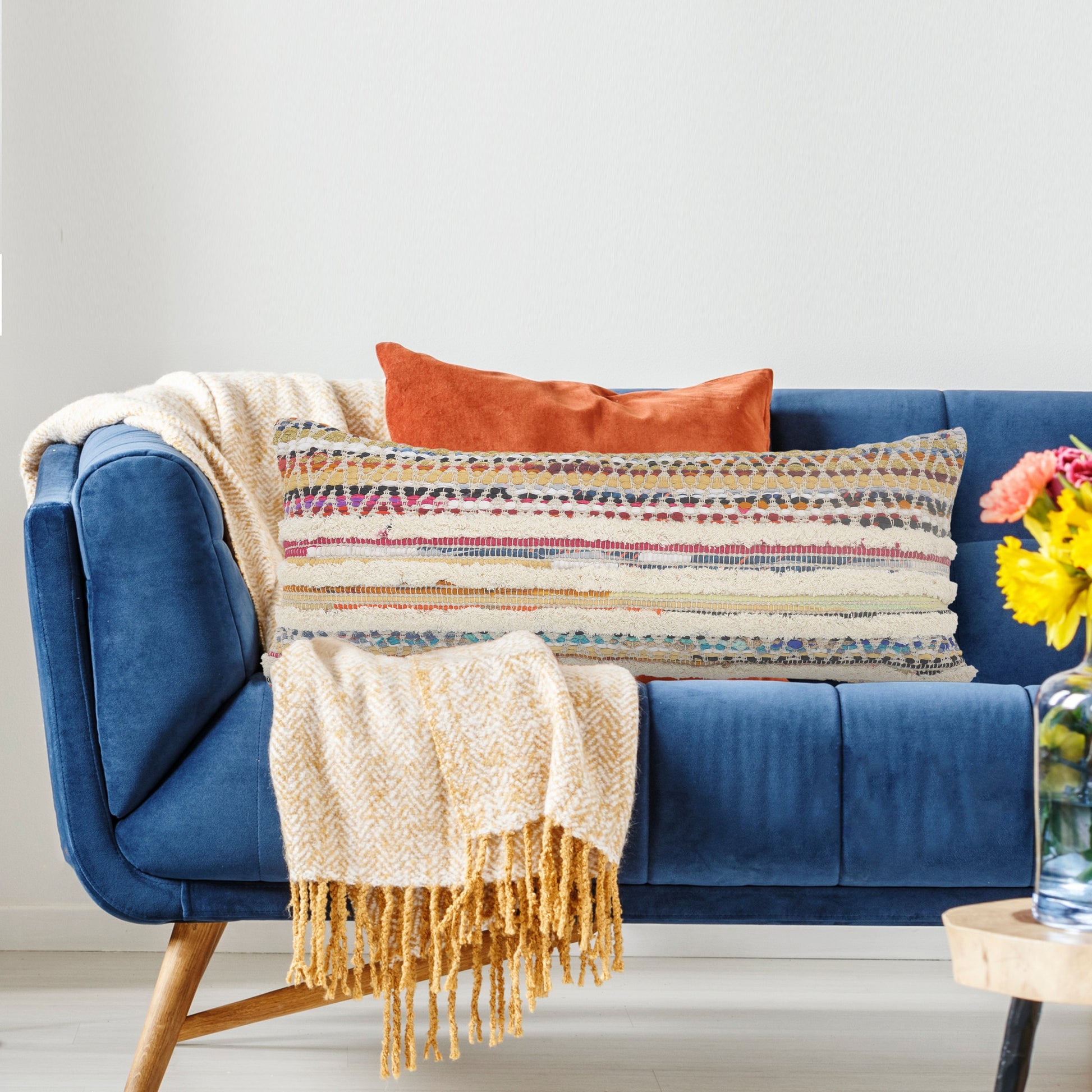 Add an air of fashion to your room and rejuvenate the space with this cute and fashionable 14-inch x 36-inch off white red and blue cotton striped throw pillow. This off white, red, and blue hued piece represents quality construction, expertly made from durable cotton that is not only long lasting but soft to the touch as well. Super soft and built to hold its shape, this polyfill-filled pillow is a great option. Great to use on its own or mix with other decorations for the perfect look. A great decorative accessory to add color and dimension to your favorite chair, accent your sofa, or to use as part of your bed ensemble. 14-inch h x 36-inch w x 7.5-inch d.