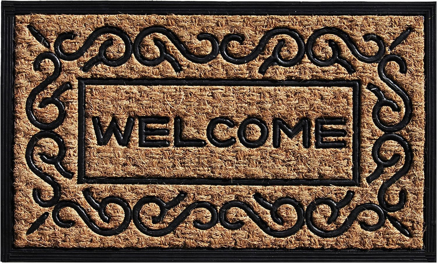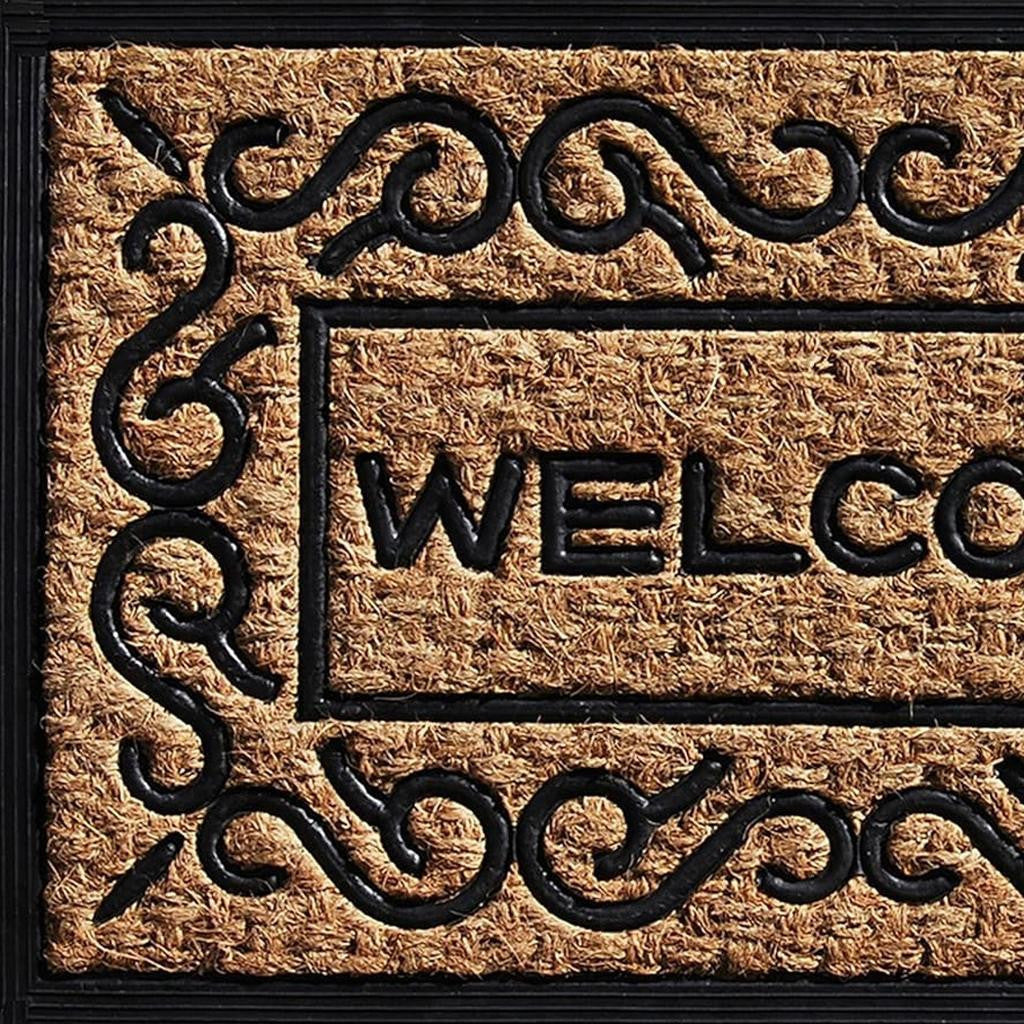 Known for it's extreme durability and ability to withstand heavy foot traffic, this 18-inch x 30-inch natural and black coir welcome outdoor door mat is an ideal option for the front door or entrance way of your home or business. Crafted from coconut husks, this mat is not only functional but is an an eco-friendly and visually appealing accessory. The naturally bristled texture of coir is an efficient way to clean dirt and mud from shoes and is easy to clean and maintain. Add this decorative mat to create a practical yet inviting welcome to all who enter. 18-inch h x 30-inch w x 0.2-inch d.