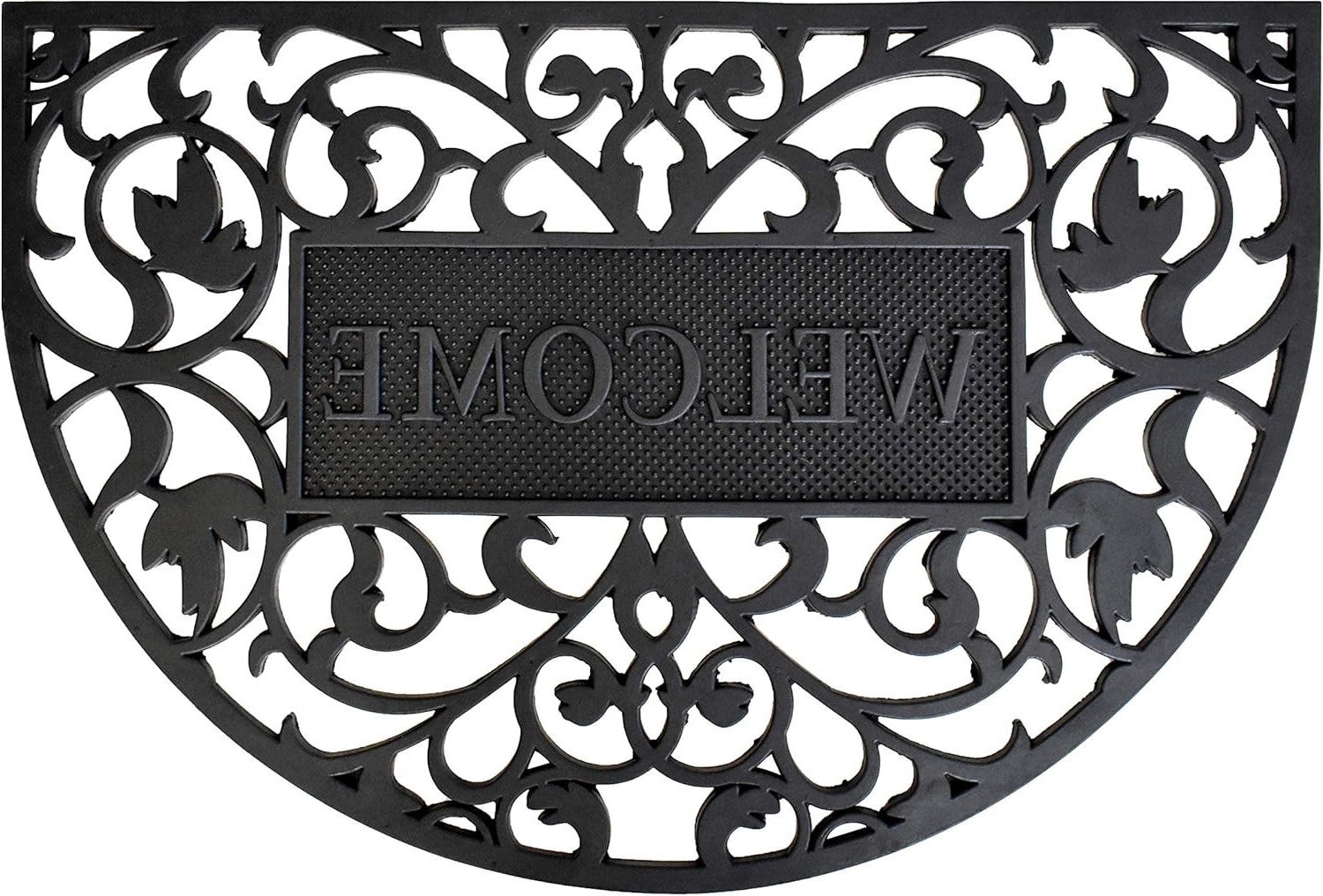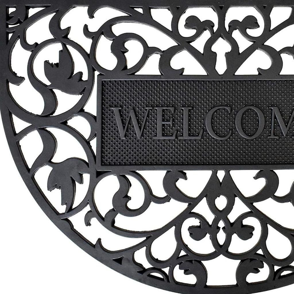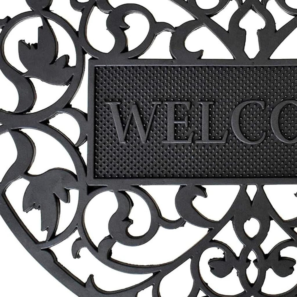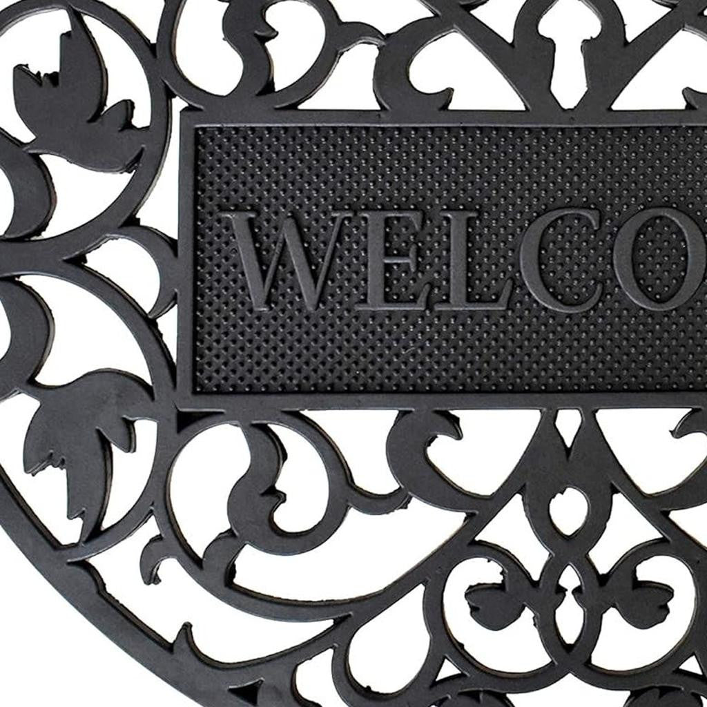 Ready to withstand heavy foot traffic, this 24-inch x 36-inch black scrollwork welcome semi circle outdoor rubber door mat is an ideal option for the front door or entrance way of your home or business. Crafted from rubber, this mat is not only functional but is a visually appealing accessory to welcome people to your home or business. Add this decorative mat to create a practical yet inviting welcome to all who enter. 24-inch h x 36-inch w x 0.5-inch d.