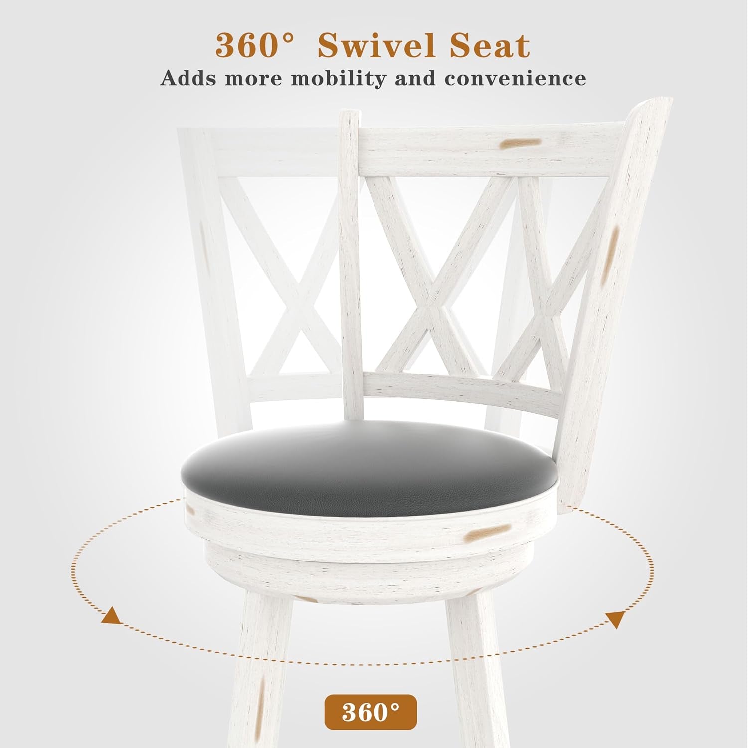 - 360° Swivel Design: Immerse yourself in the rustic charm of our farmhouse-inspired bar stools, featuring a 360-degree swivel design for seamless movement. Whether you're savoring morning coffee or hosting gatherings, enjoy the convenience and style these stools bring to your space.