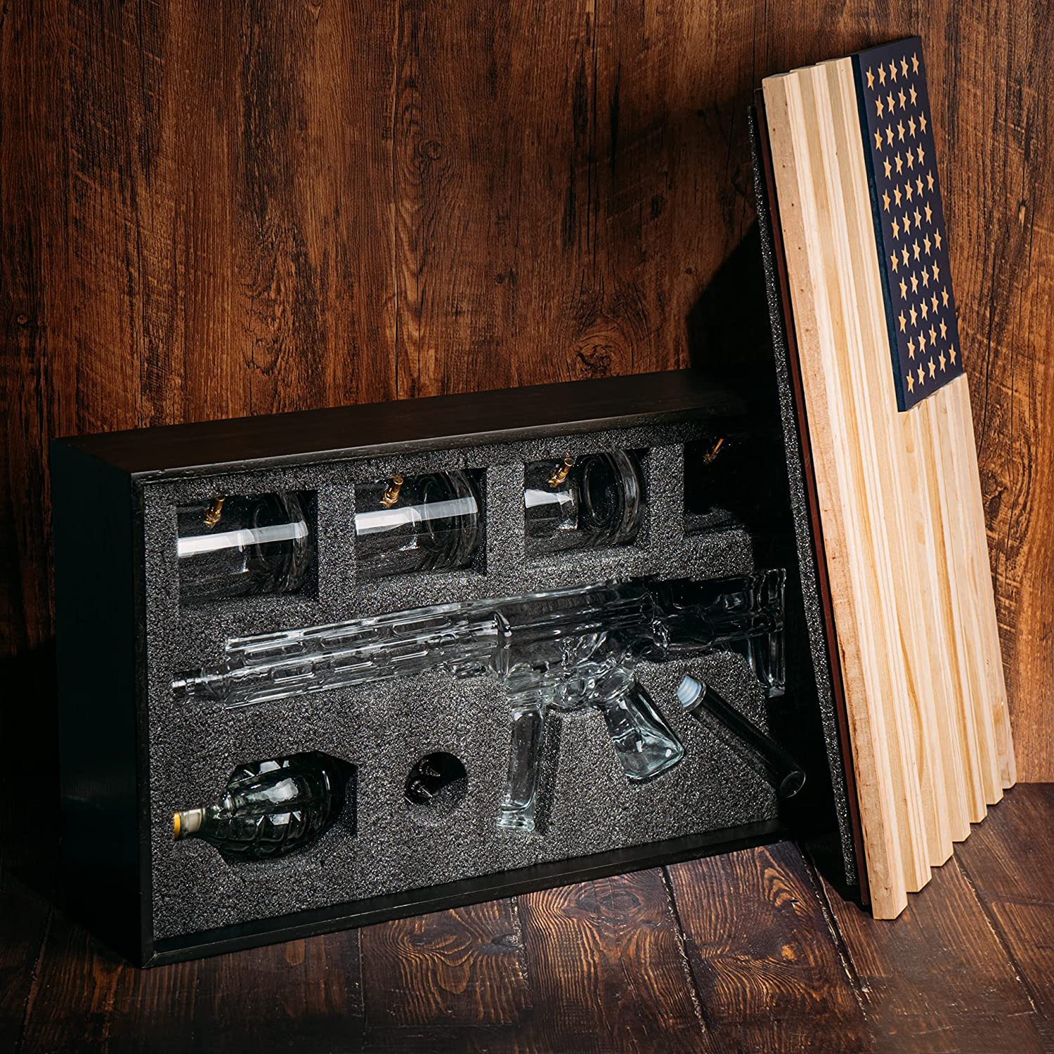 AR15 Whiskey Gun Decanter Flag Set - 1000ml Rifle & Pistol Set - Hanging Storage American Flag Gift Box & Bullet Glasses & Shot Glass, Great Gift for Army, Navy, Marines, Veterans & Gun Enthusiasts