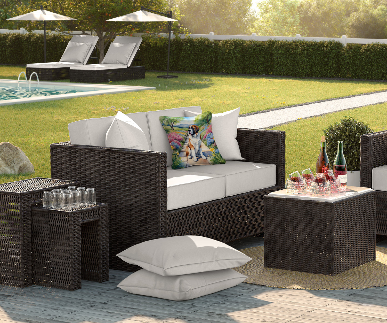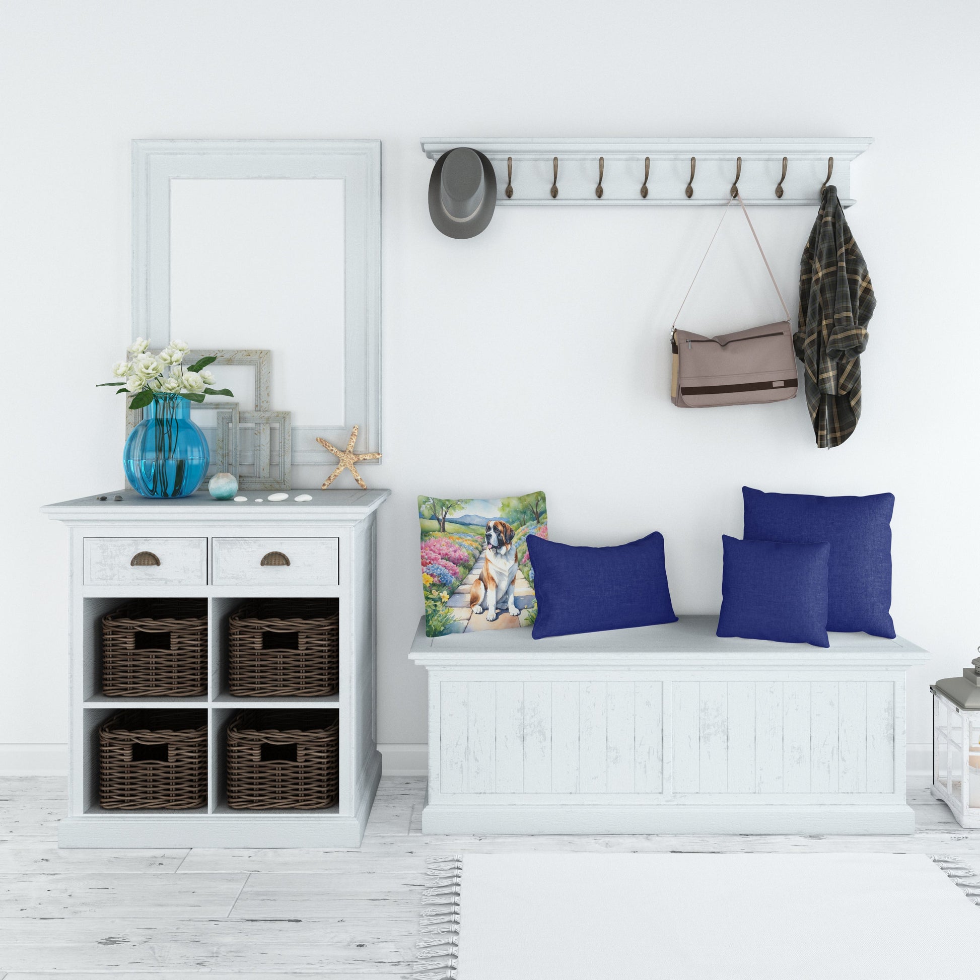 Throw Pillow featuring breed specific Saint Bernard artwork. Revitalize your outdoor or indoor living space with Caroline's Treasures 18x18 Fabric Decorative Pillow. With a generously sized dimension of approximately 18 inches by 18 inches, this pillow makes a comfortable and aesthetic addition to any seating area. Made from a unique, water-resistant material developed by Caroline's Treasures, the pillow sham is 100% polyester fabric that's durable and ready to weather any condition. Its vibrant, full-color artwork will not fade over time as it is dyed with color-fast dyes. Whether you place it on your patio furniture, porch, veranda, or indoor couch, its soft canvas fabric ensures a cozy experience. The pillow is handcrafted in the United States, featuring a sham created from three pieces of fabric and a polyester insert for enduring shape and overstuffed comfort. Despite being robustly built to endure the outdoors, it is as soft and snug as your favorite indoor cushions. Please note, as all our pillows are handmade, sizes may vary slightly, adding to the charm of this unique decorative item.