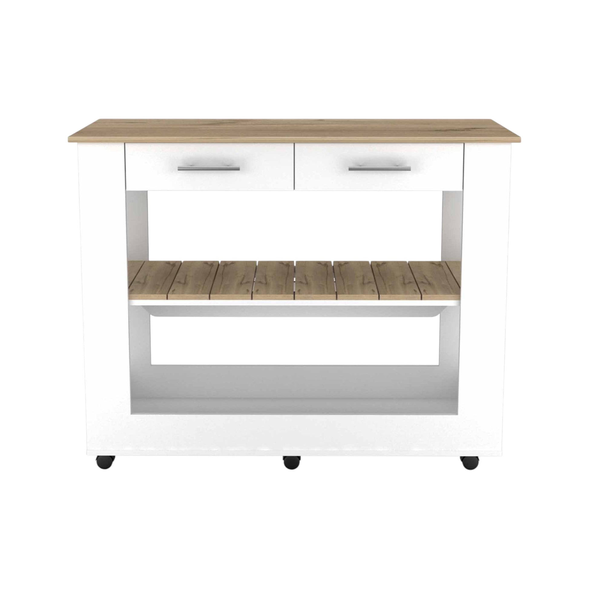 The addition of an island or cart can be used for a variety of tasks, from food preparation and cooking to serving and dining. This white and brown 40-inch rolling kitchen cart with storage stands out from the rest because of its excellent design and versatility. Made of a combination of durable manufactured wood this rectangular cart is a portable organizing solution that provides extra storage and counter space in your kitchen. This unit features purposeful distressing for a slightly rustic and vintage design styling. Drawer storage also helps to keep those handy utensils and serving essentials neat, tidy, and ready to be used. Maximize your space with this multi- functional and good looking kitchen cart. 36.7-inch h x 40-inch w x 20-inch d.