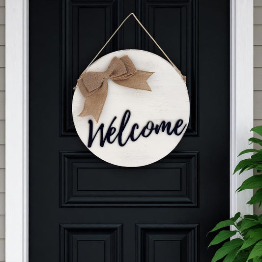 14" White Solid Wood Welcome And Hello Bow Reversible Hanging Wall Or Door Decor